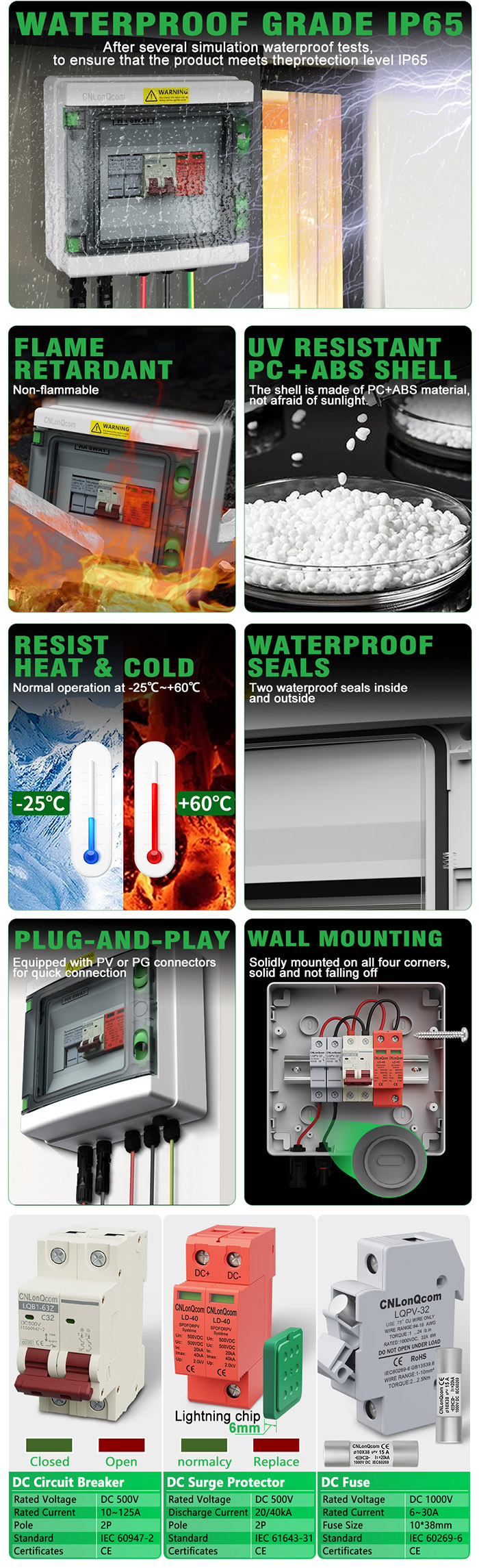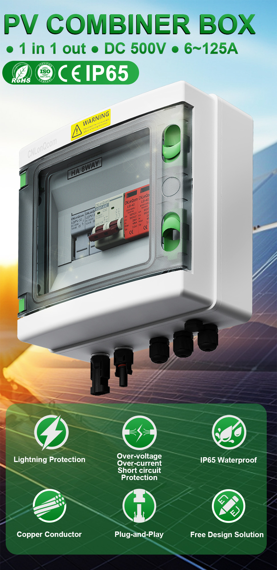 Cnoplakomcomcomy Hirs chies Prichic PV CV मिलान कमिनर बक्स 1 1 मा DC500V / 600V / 800V मा प्रयोग गरीन्छ र अफ-ग्रिड वा ग्रिड-जडान प्रणालीहरूमा प्रयोग गरिन्छ। जस्तैPV प्यानल, आरभी, डु boat ्गा, आउटडोर PV, घर, आदि.